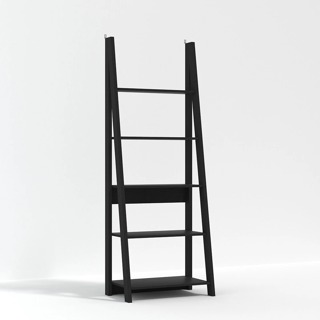 Overall Look: Sleek black ladder-style shelving unit with clean, modern lines